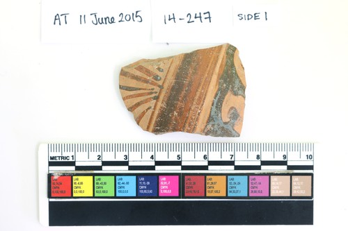 14-247 (6038013) Frgt of painted pottery. Broken on all sides. Pinkish-beige fabric with evidence …
