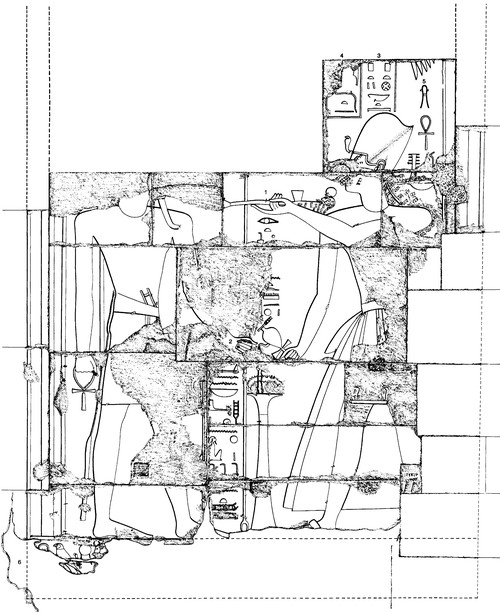 الملك يتألق ويصب القربان في معبد الكرنك: تفاصيل اللوحة 5 الجدار الغربي القسم الشمالي. انظر اللوحة 9.