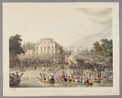 Arrival at Brandenburgh House of the Watermen &c. with an Address to … This colored aquatint depicts a number of small vessels arriving by river …