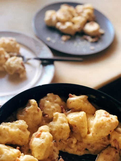 Plated Kniddelen 2 A picture of two plates of kniddelen, one with a fork, pan …
