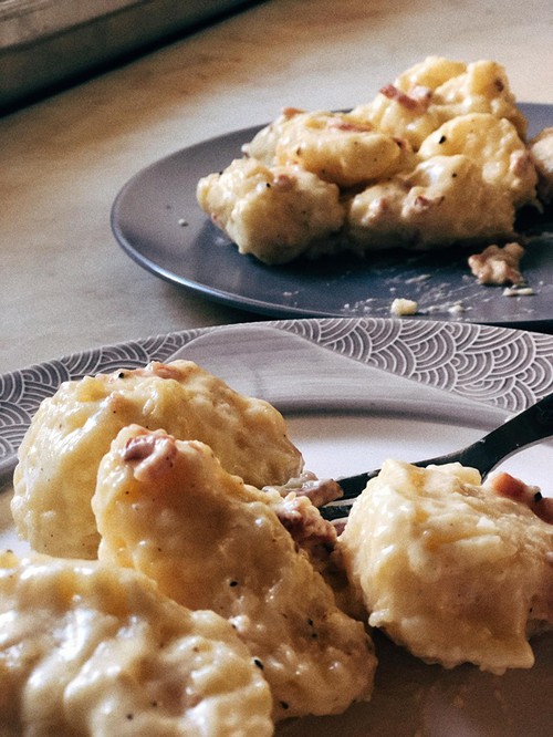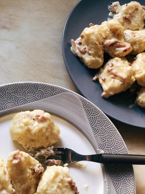 Plated Kniddelen 3 A picture of two plates of kniddelen, one with a fork (above …