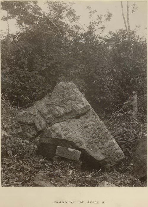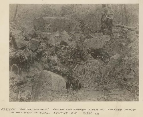 Fallen and broken Stela 12 on isolated point of hill east of … Copan Album: Volume 11, Page 36; Written on page: "Eastern 'Piedra Pintada.' …