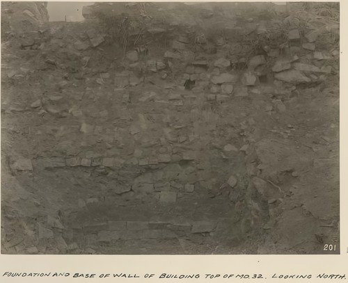Foundation and base of wall of building top of Mound 32, looking … Copan Album: Volume 3, Page 40; Written on page: "Foundation and base …