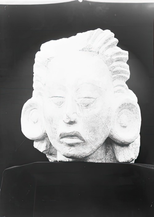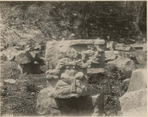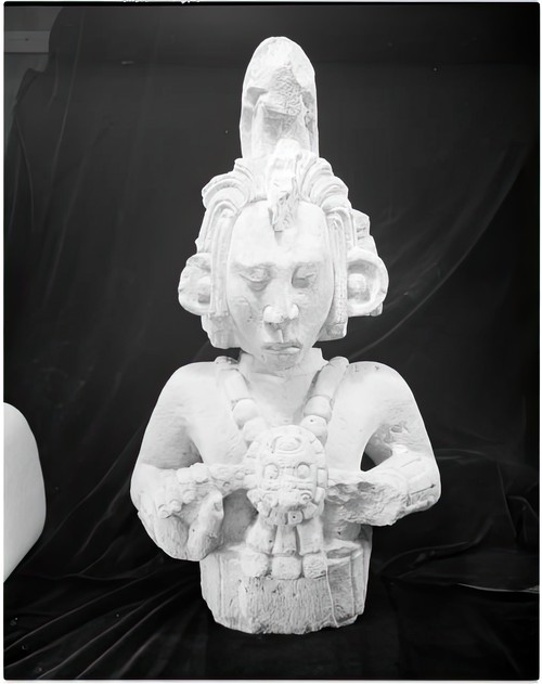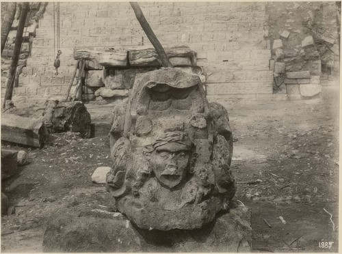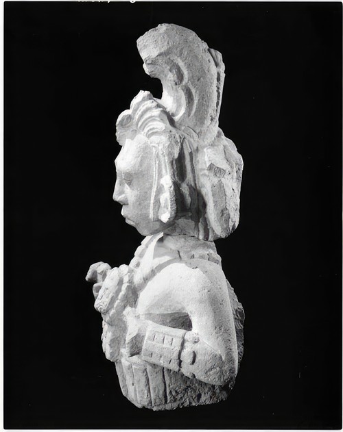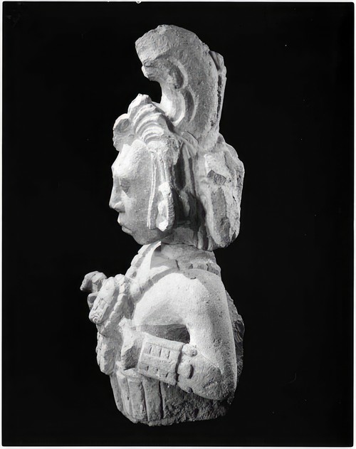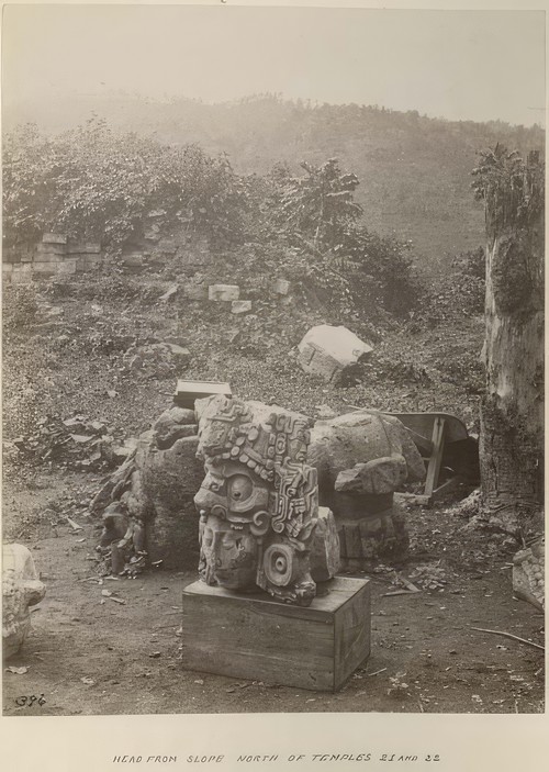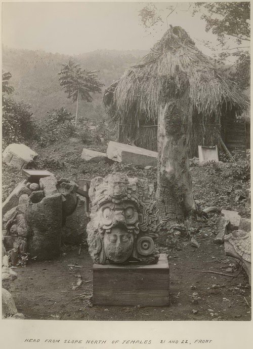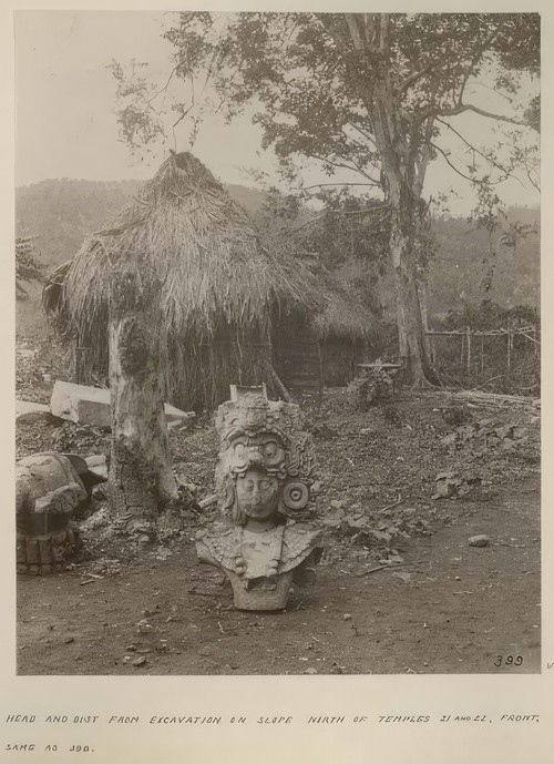 Head and bust from slope north of Temples 21 and 22, front Copan Album: Volume 9, Page 47; Written on page: "Head and bust …