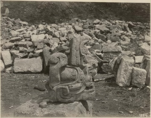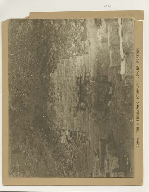 Hieroglyphic stairway, cleared 1899-1900, showing blocks from debris and Mound 26 Copan Album: Volume 10, Page 35