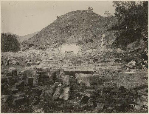 Hieroglyphic stairway, cleared 1899-1900, showing blocks from debris and Mound 26 Copan Album: Volume 10, Page 30