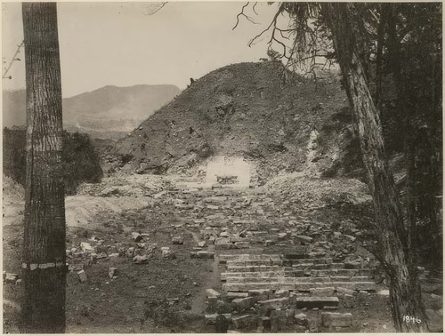 Hieroglyphic stairway, cleared 1899-1900, showing blocks from debris and Mound 26 Copan Album: Volume 10, Page 36