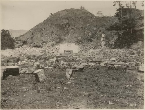 Hieroglyphic stairway, cleared 1899-1900, showing blocks from debris and Mound 26 Copan Album: Volume 10, Page 33