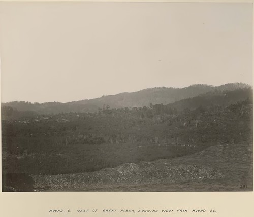 Mound 6, west of Great Plaza, looking west from Mound 26 Copan Album: Volume 7, Page 23; Written on page: "Mound 6. West …