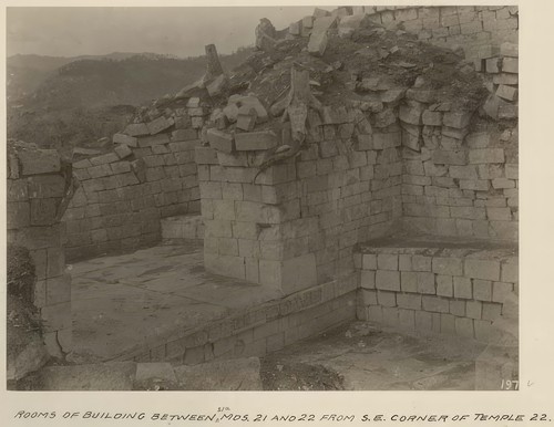 Rooms of building between 21A, Mounds 21 and 22 from southeast corner … Copan Album: Volume 3, Page 28; Written on page: "Rooms of building …