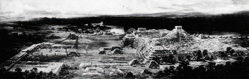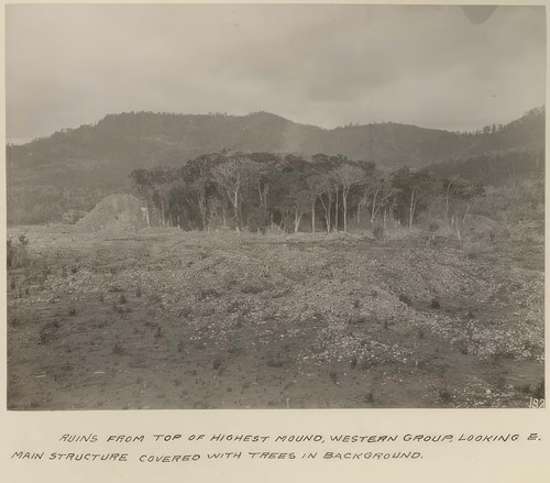 Ruins from top of highest mound, western group, looking east Copan Album: Volume 2, Page 45; Written on page: "Ruins from top …