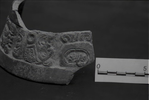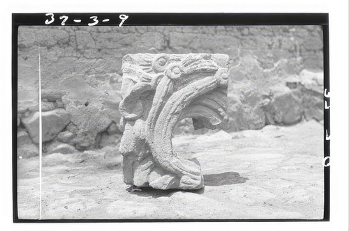 Sculptures found lying at eastern base of Mound 7 Copan Album: Volume 2, Page 27; Written on page: "Sculptures found lying …