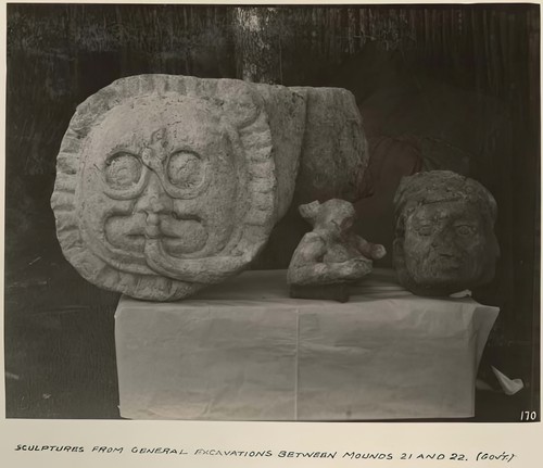 Sculptures from general excavations between Mounds 21 and 22 Copan Album: Volume 2, Page 30; Written on page: "Sculptures from general …