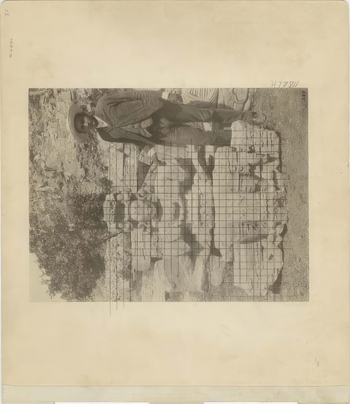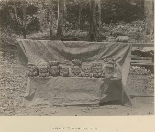 Sculptures from excavations near western and southern sides of Mound 21 Copan Album: Volume 2, Page 29; Written on page: "Sculptures from excavations …