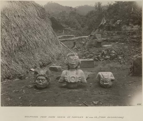 Sculptures from hieroglyphic stairway Copan Album: Volume 9, Page 21; Written on page: "Sculptures from hieroglyphic …