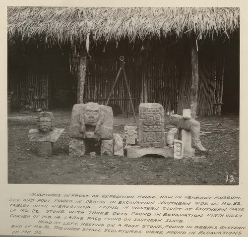 Sculptures in front of expedition house Copan Album: Volume 2, Page 28; Written on page: "Sculptures in front …