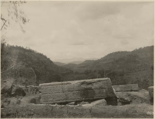 Stela 13 and Copan Valley, looking southwest Copan Album: Volume 11, Page 39; Written on page: "St 13"