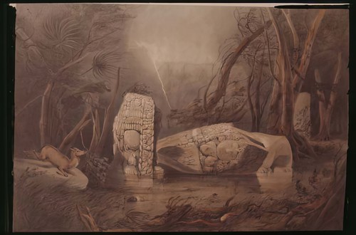 Stelae at Copan, and deer Photograph of Frederick Catherwood colored Lithograph. Written on slide: "Catherwood"