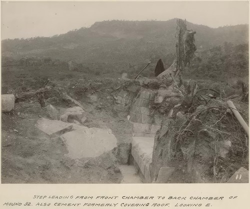 Step leading from front chamber to back chamber of Mound 32 Copan Album: Volume 3, Page 36; Written on page: "Step leading from …