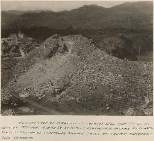 View from top of Pyramid 16, looking northeast, Temple 22 at left Copan Album: Volume 3, Page 17; Written on page: "View from the …