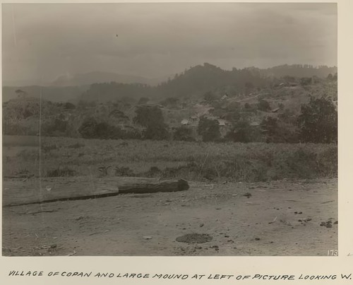 Village of Copan and large mound at left, looking west Copan Album: Volume 5, Page 13; Written on page: "Village of Copan …