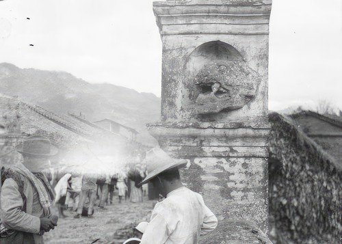 Crowd gathered near zoomorphic stone carving from Copan at Esquipulas Stone carving from Copan at Esquipulas, Guatemala. 3 1/4" x 4 1/4". …