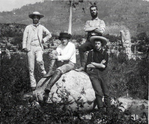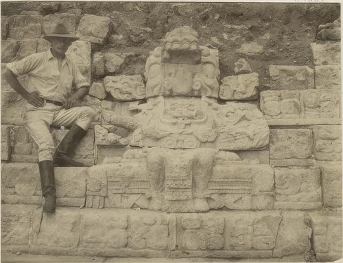Dr. George Byron Gordon with seated figure in Hieroglyphic Staircase Written on board: Honduras / Copan / Great seated figure brought to …