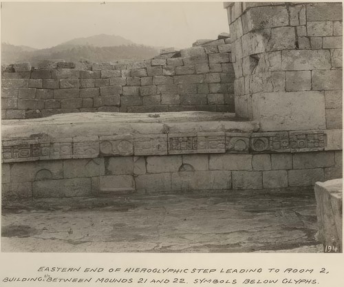 Eastern end of hieroglyphic step leading to Room 2, building 21A between … Copan Album: Volume 3, Page 26; Written on page: "Eastern end of …