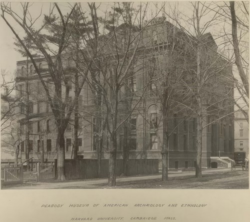 Exterior of Peabody Museum of Archaeology and Ethnology, horse-drawn carriage at far … Copan Album: Volume 1, Page 1; Written on page: "Peabody Museum of …
