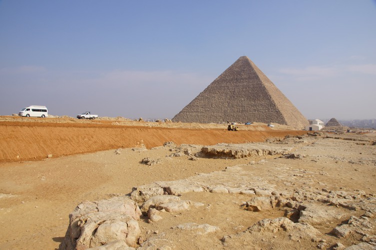 حدد علماء الآثار أن حجر الأهرامات جاء من مناطق مختلفة. تم بناء الأهرامات في الغالب من الحجر الجيري ، مباشرة على الهضبة إلى الجنوب من الأهرامات. عند الانتهاء تقريبًا ، تمت تغطية كل هرم بالكامل بحجر جيري أبيض ناعم من طرة ، على بعد حوالي تسعة أميال أسفل مجرى النهر وعبر النيل من الجيزة. تم استخراج هذا الحجر الجيري من الأنفاق تحت الأرض ، بدلاً من تقنيات التعدين المكشوف ، تم استخدام كتل الجرانيت من أسوان في منطقة حجرة دفن الملك. تم تعويم هذه الحجارة على الصنادل من على بعد أكثر من 500 ميل وجلبت إلى القنوات العميقة مباشرة على هضبة الجيزة. في العصور القديمة ، اقتربت مياه النيل من الهضبة حيث توجد المدينة الحديثة اليوم.