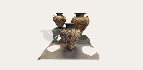 Three-handed Palace Style amphora with three octopuses, This artifact, a three-handled amphora featuring three octopuses, dates back to the …