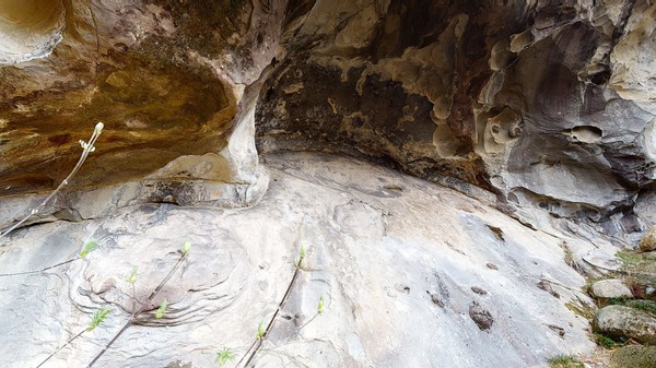 Rock art cave or rockshelter system in California, featuring handprints and …