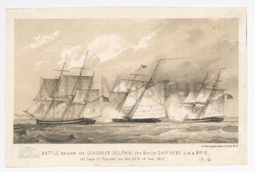 BATTLE between the SCHOONER DOLPHIN, the British SHIP HEBE and a BRIG, … Tinted lithograph depiction of the battle between the schooner Dolphin, the British …