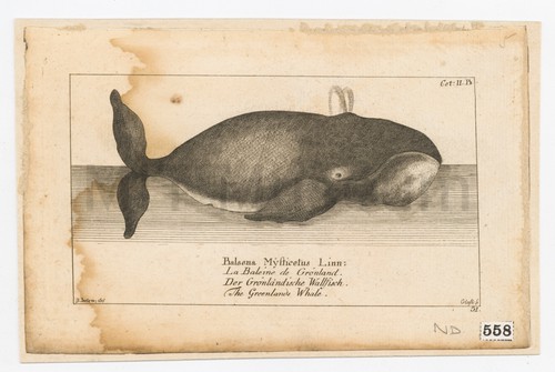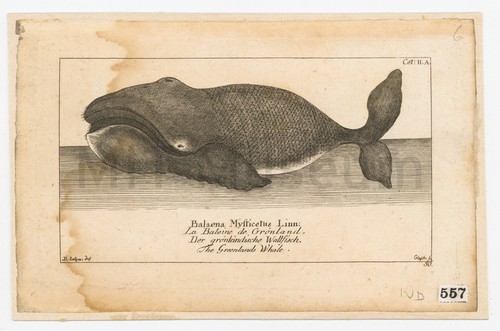 Balaena Mysticetus Linn: La Baleine de Gronland. Der gronleindische Wallfisch. The Greenland … Black and white engraving of the Greenland Whale. Title in Latin, French, …
