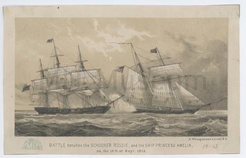BATTLE between the SCHOONER ROSSIE, and the SHIP PRINCESS AMELIA, on the … Tinted lithograph depiction of the schooner Rossie engaging the British packet-ship Princess …