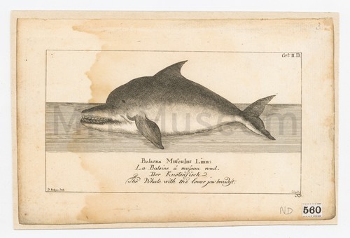 Balaena Rostrata Mull: Der kline Wallfisch. Andernesia Island. Black and white engraving of the Andernesia Island dolphin. Title in Latin, …