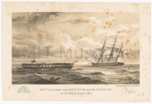 BATTLE between the CONSTITUTION and the GUERRIERE, on the 19th of August … Tinted lithograph depicting, at left, a gunship with all her masts felled …