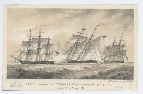 BATTLE between the SCHOONER ATLAS and two BRITISH SHIPS, on the 5th … Tinted lithograph depiction of the U.S. schooner Atlas engaging the British merchantmen …