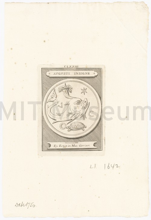 Augusti Insigne Uncolored engraving, labeled (plate) CLXXIII, depicting a stone carved with a dolphin, …