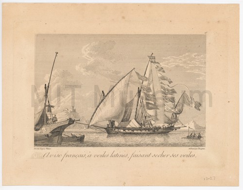 Aviso fran̤ais, �� voiles latines, faisant secher ses voiles. A French dispatch aviso (a kind of dispatch boat or "advice boat") …