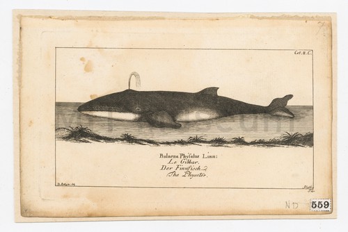 Balaena Physalus Linn: Le Gibbar. Der Finnfisch. The Physeter. Black and white engraving of the the Physeter spouting water. Title in …