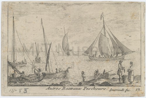 Autres Batteux Pescheurs. Engraving depicting fishing boats approaching a coast in the right-hand foreground. Title, …