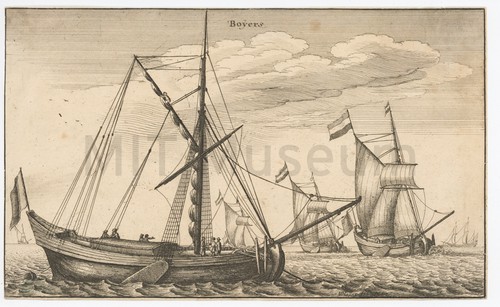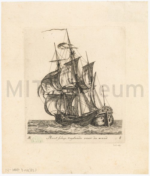Boot schip, zeylende voor de wind Etching depicting a three-quarters stern view of a three-masted, cannonless vessel at …