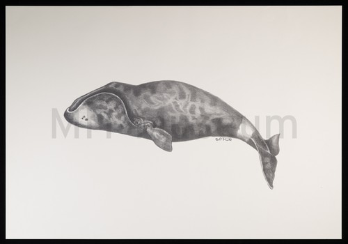 Blunt headed Cachalot Pl. VIII Vol. 3 p. 79 Monochrome engraving of a male blunt-headed cachalot, facing right, with a dimple …