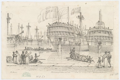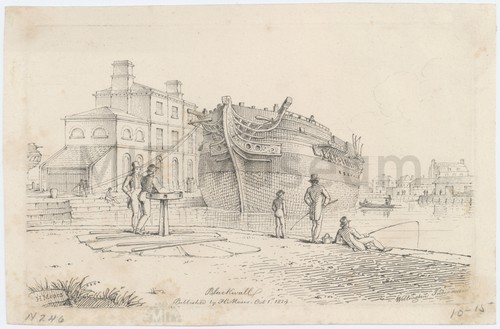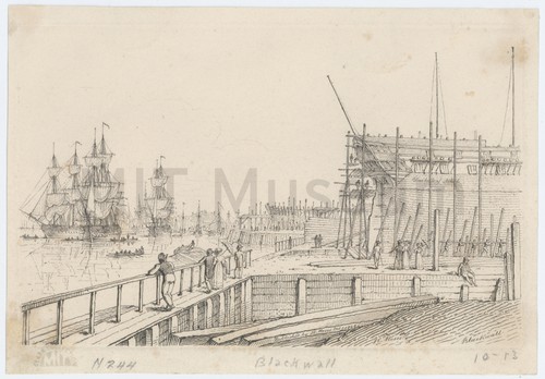Blackwall. "Wellington", Indiaman. Bow view of the Indiaman "Wellington" at dock, without spars or rigging. …