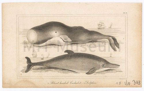 Blunt Headed Cachalot and Dolphin Plate 73 Black and white engraving of two cetaceans. Above, a beached blunt-headed cachalot, …