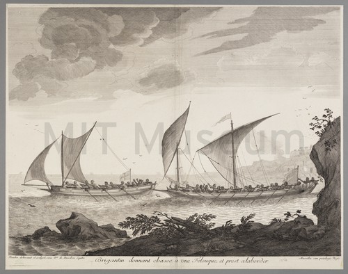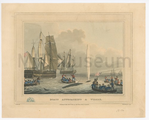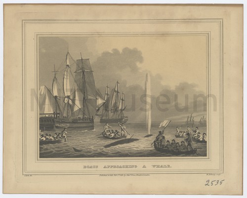 Boats approaching a whale. Stipple engraving showing five whaleboats drawing near to a whale, with harpooneersmen …