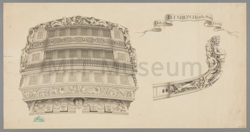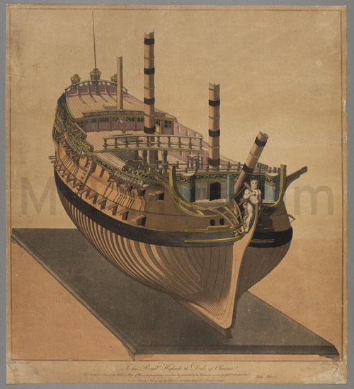Bow View of Ship Model of the Man-of-War "Valiant" A colored etching of the three-quarter bow and starboard-side view of the …
