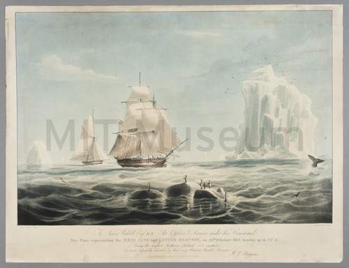 Brig Jane and Cutter Beaufoy Etching depicting British naval vessels in the antarctic. "To James Weddell Esq. …