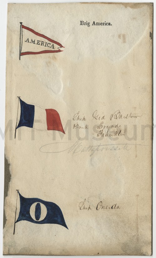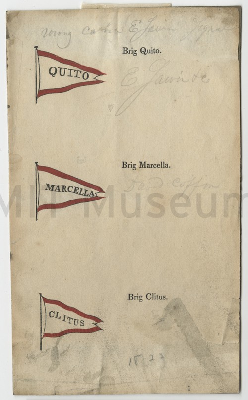 Brig Elizabeth - Bark Clarion - Ship Milos Drawing in colored ink of company flags used in New England shipping, …